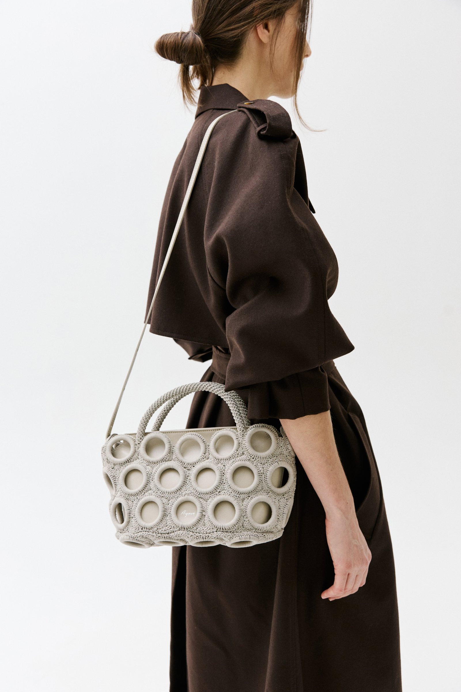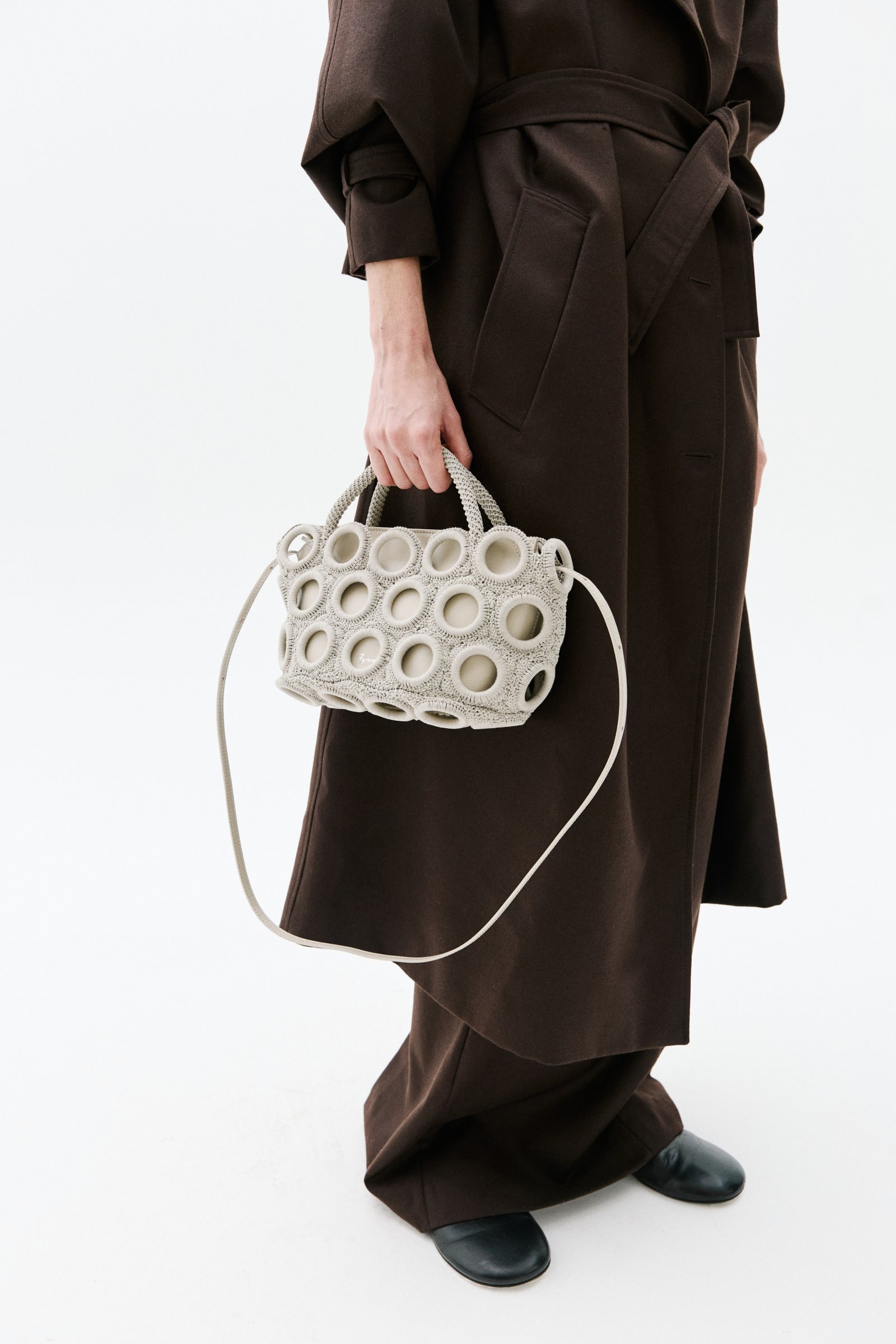 HAND-WOVEN OPENWORK BASKET WITH WAXED COTTON CORD. DETACHABLE INTERNAL BAG MADE OF COWHIDE LEATHER WITH METALLIC ZIPPER. THEY CAN BE WORN SEPARATELY. IT HAS AN INTERNAL POCKET AND A LONG THIN COWHIDE STRAP.