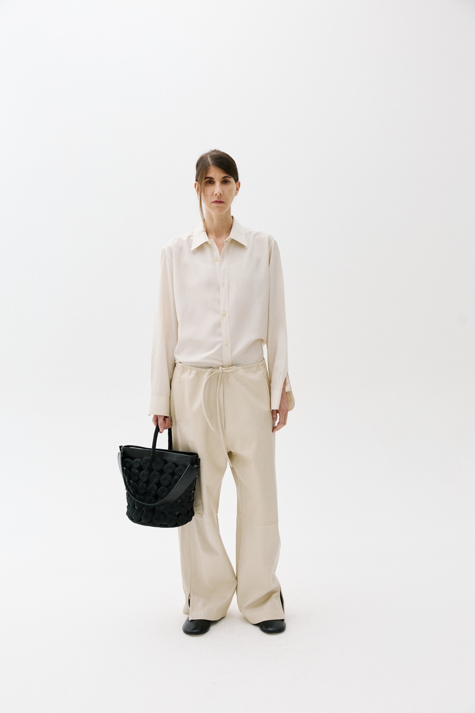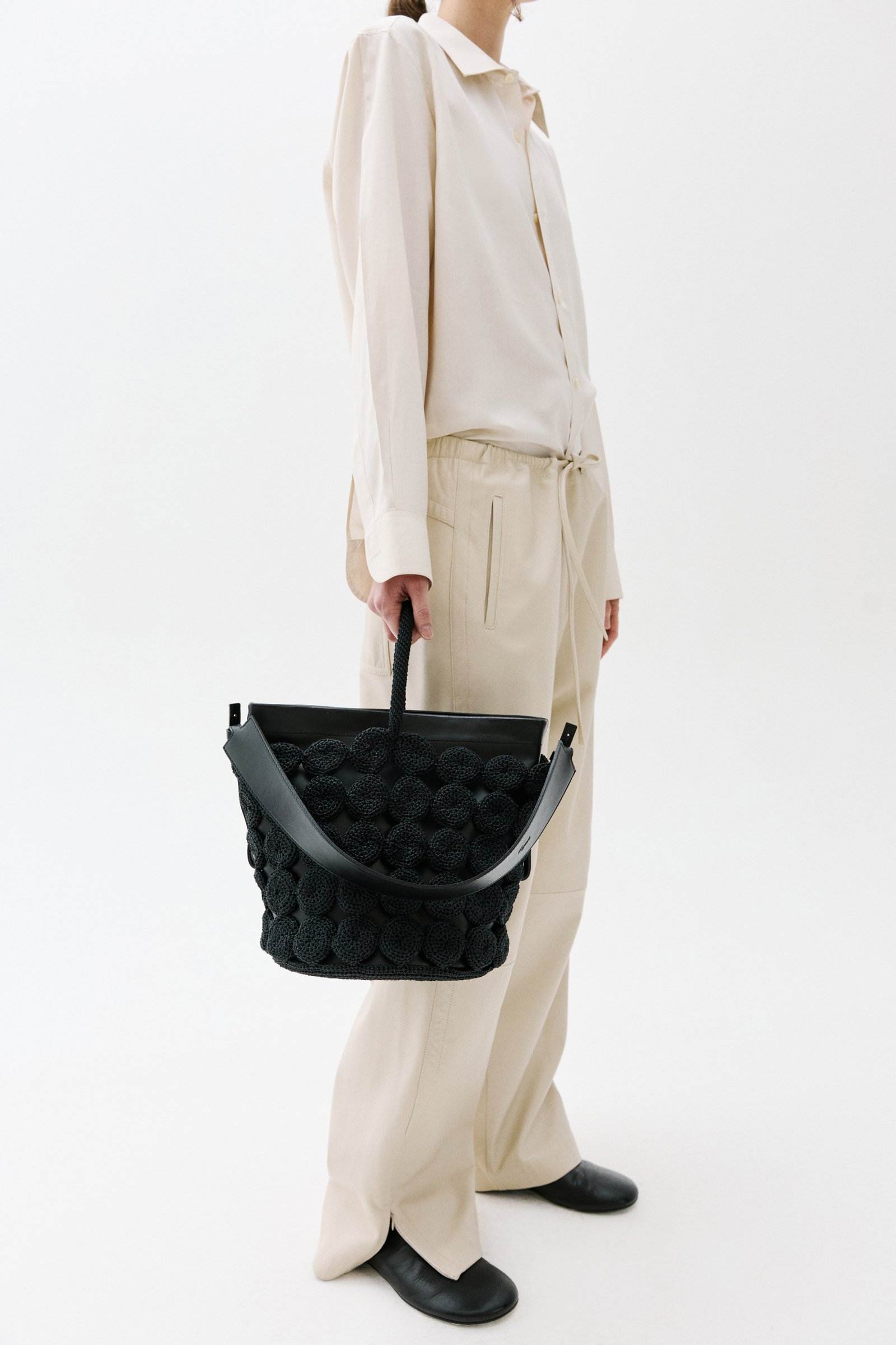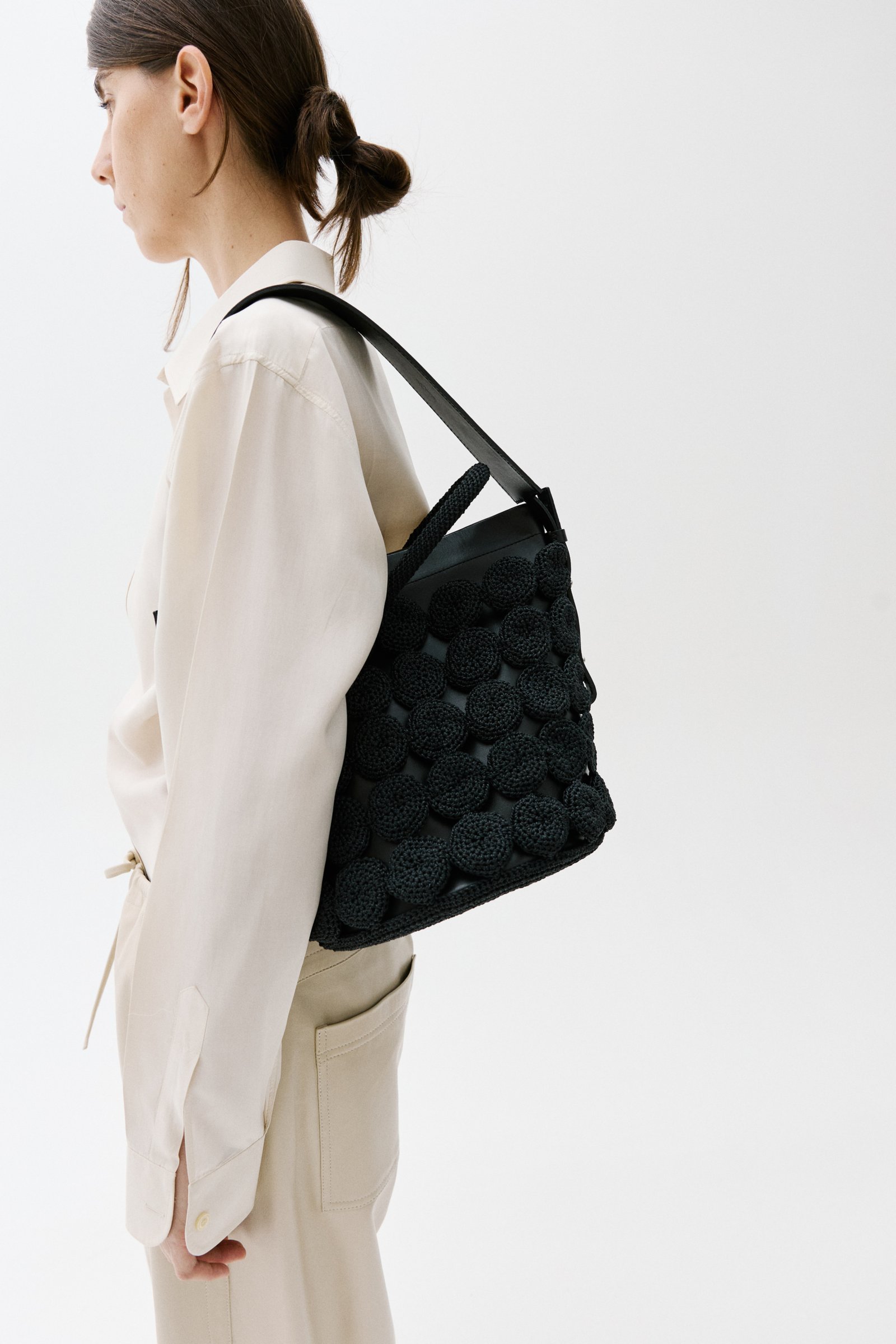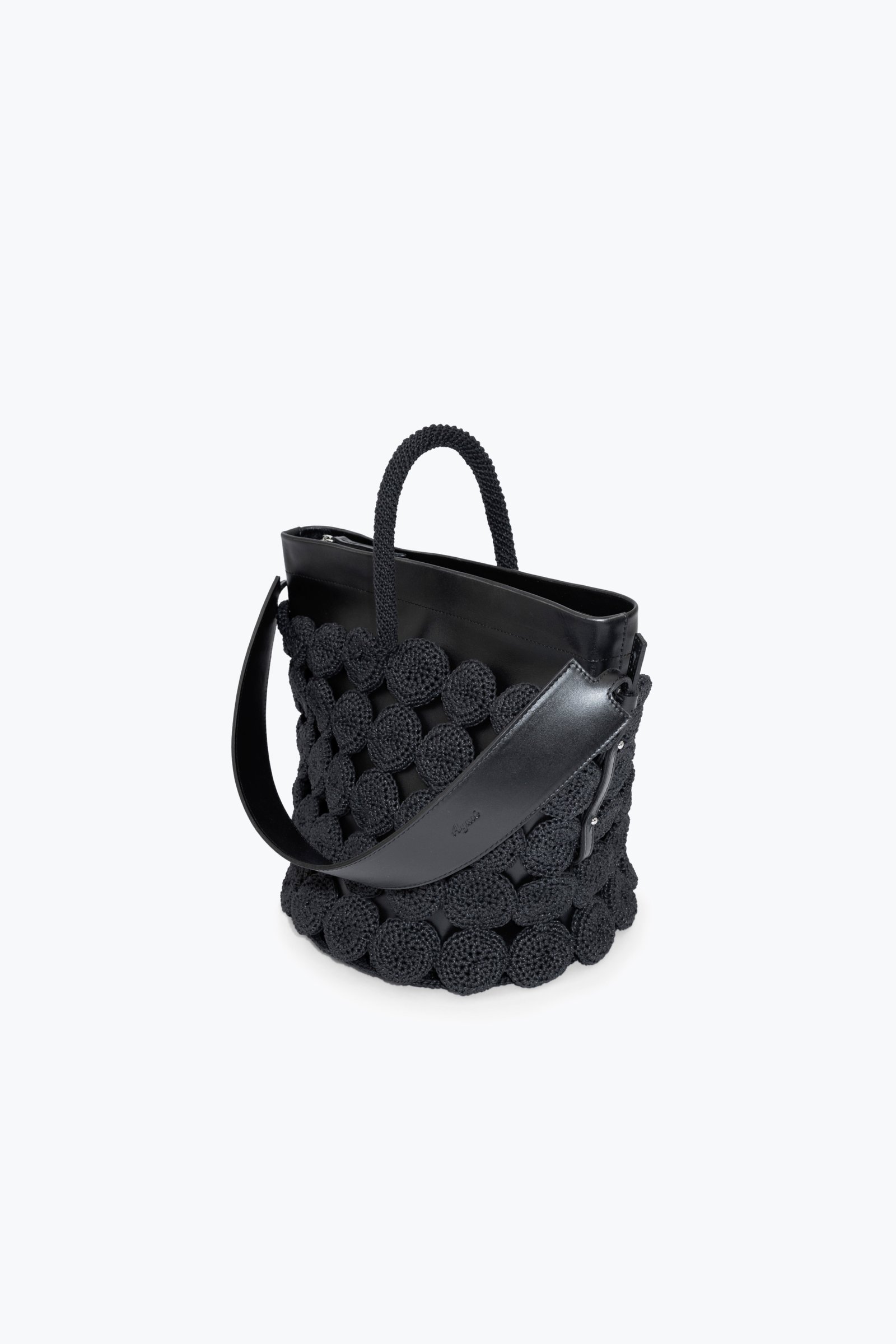 HAND-CROCHETED WAXED COTTON CORD BASKET. COWHIDE REMOVABLE INTERNAL BAG WITH METALLIC ZIPPER. CAN BE USED SEPARATELY. ADJUSTABLE COWHIDE STRAP.