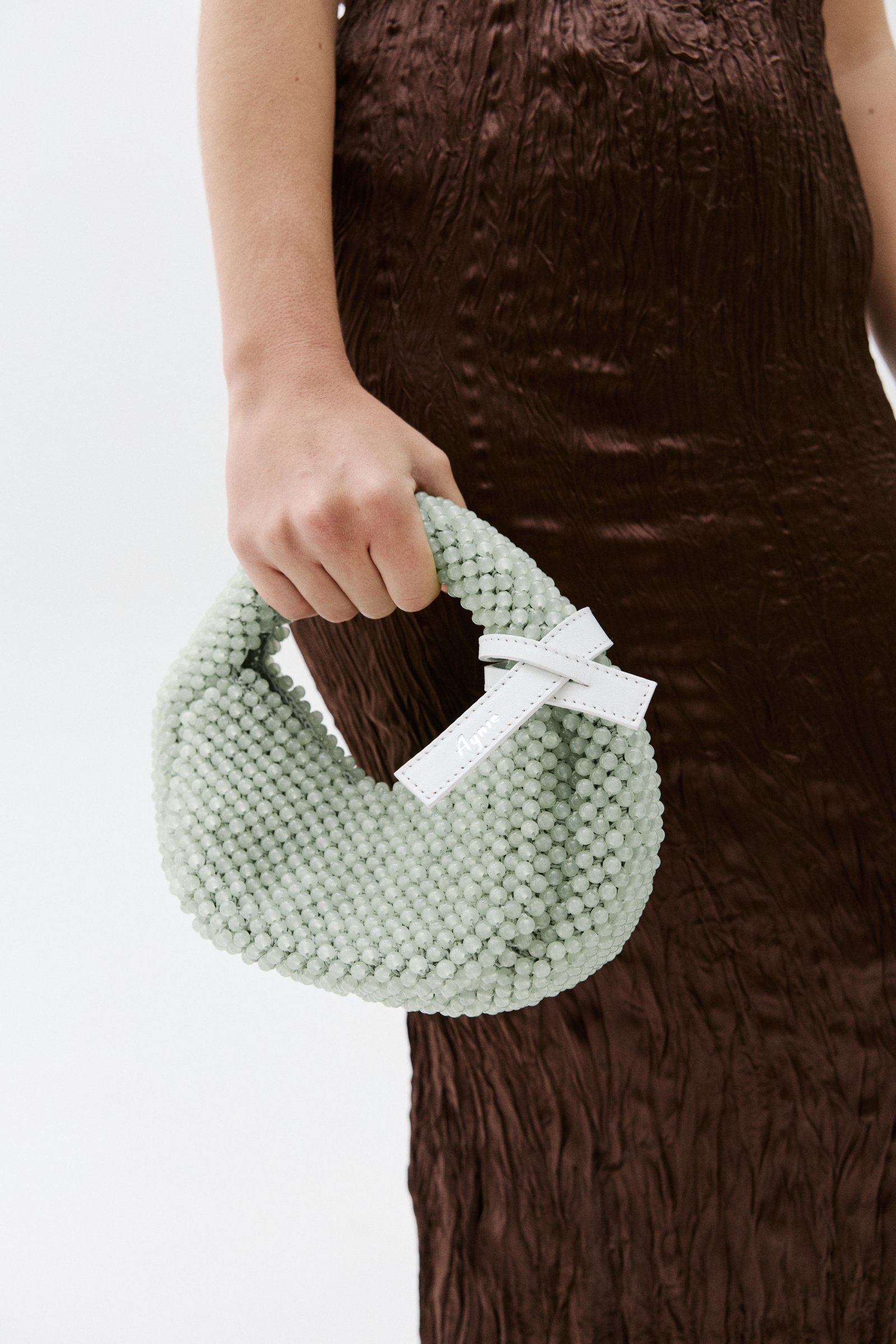 HAND-CROCHETED BAG IN COTTON CORD AND GLASS BEADS. IT HAS A MAGNETIC CLOSURE AND A COWHIDE DETAIL.