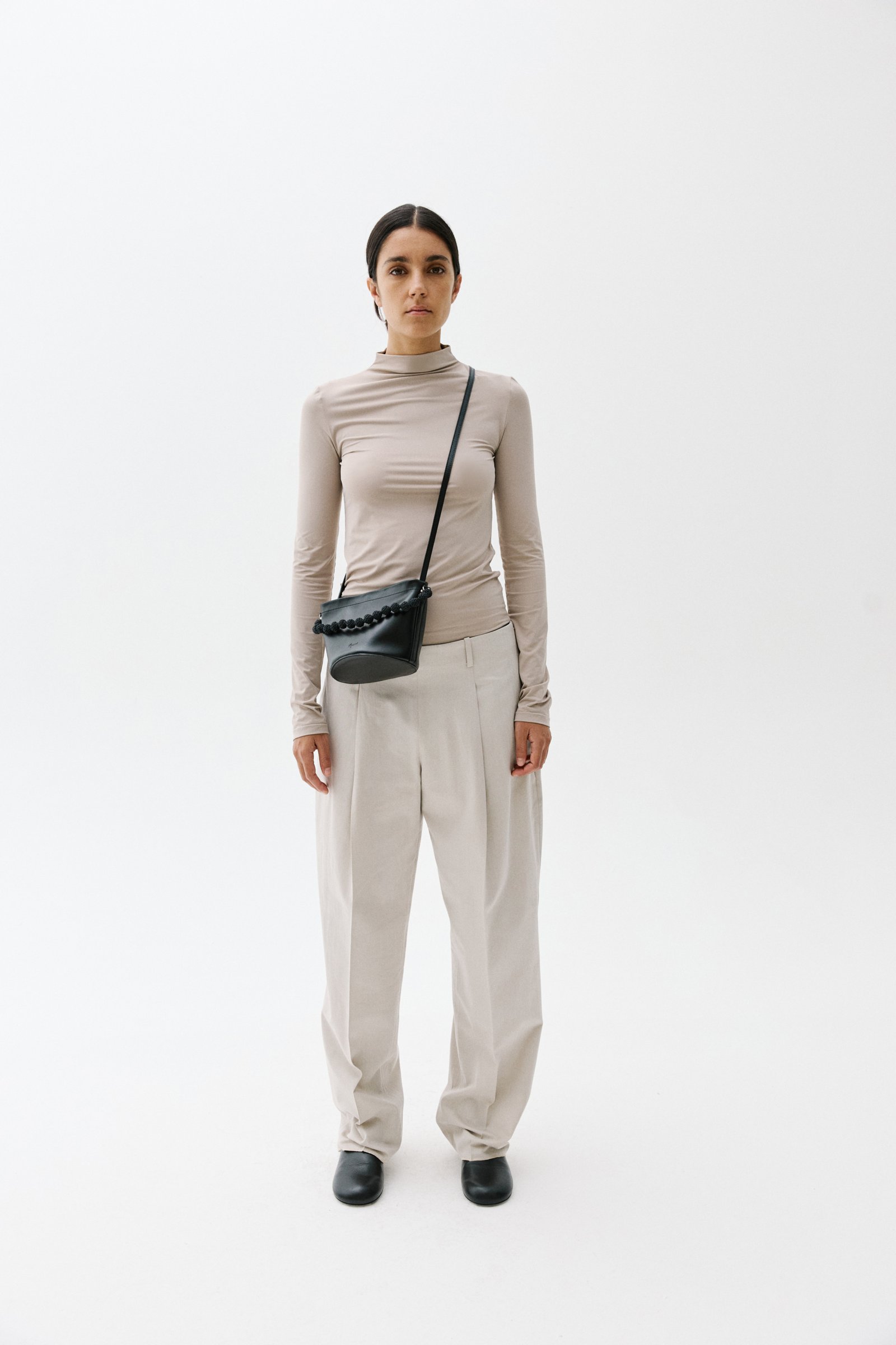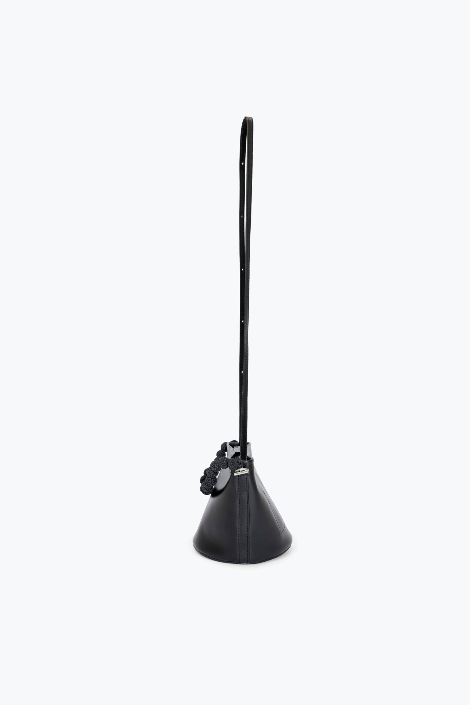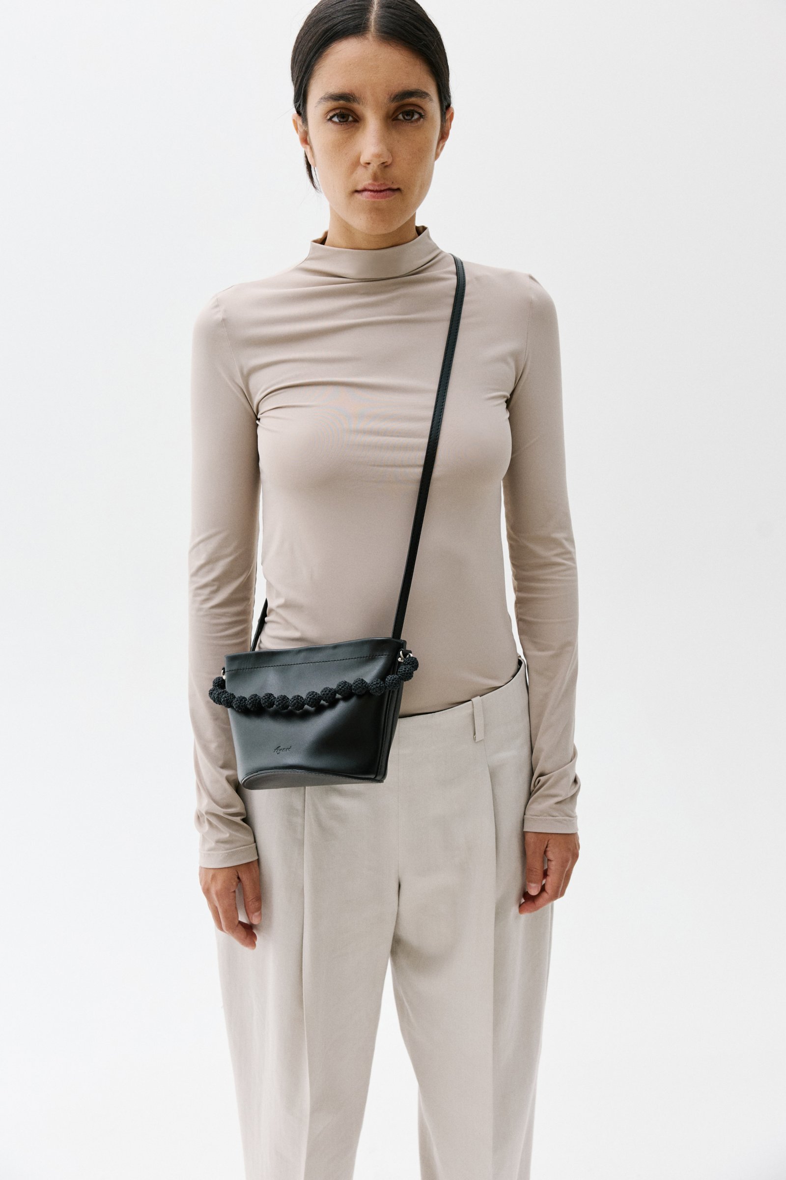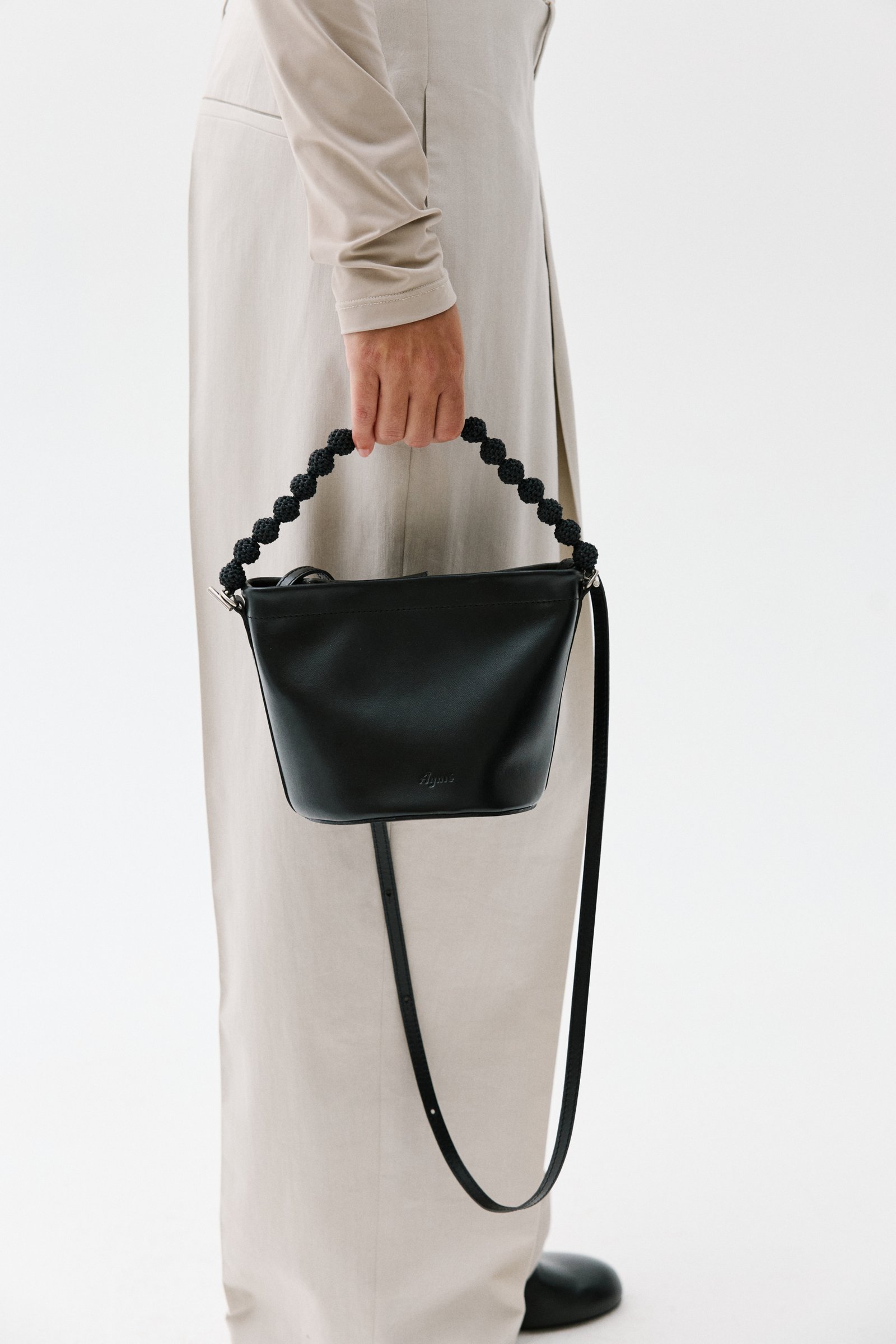 COWHIDE BAG WITH METALLIC ZIPPER. IT HAS A SHORT STRAP HAND-CROCHETED WITH WAXED COTTON CORD AND A LONG ADJUSTABLE COWHIDE STRAP.