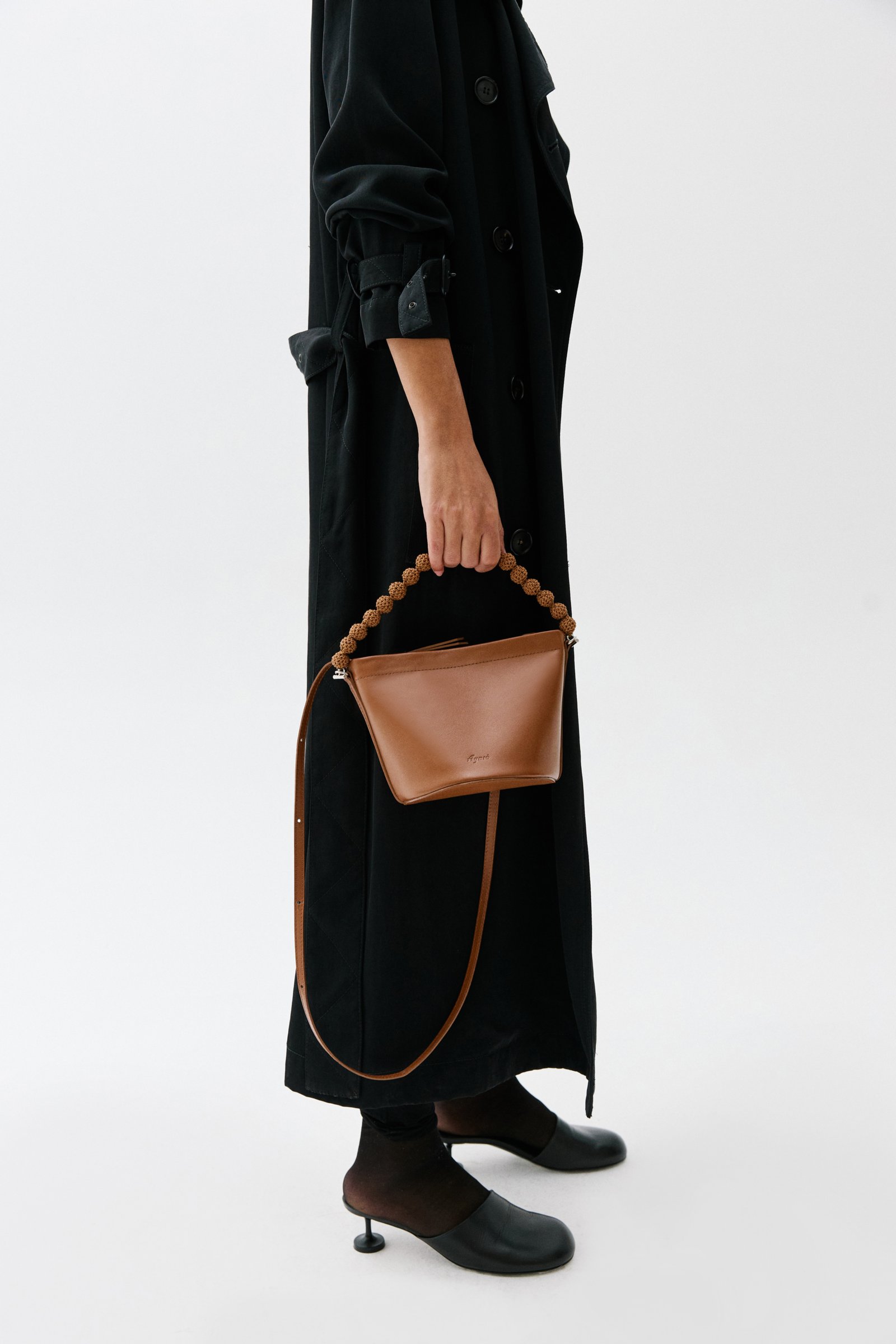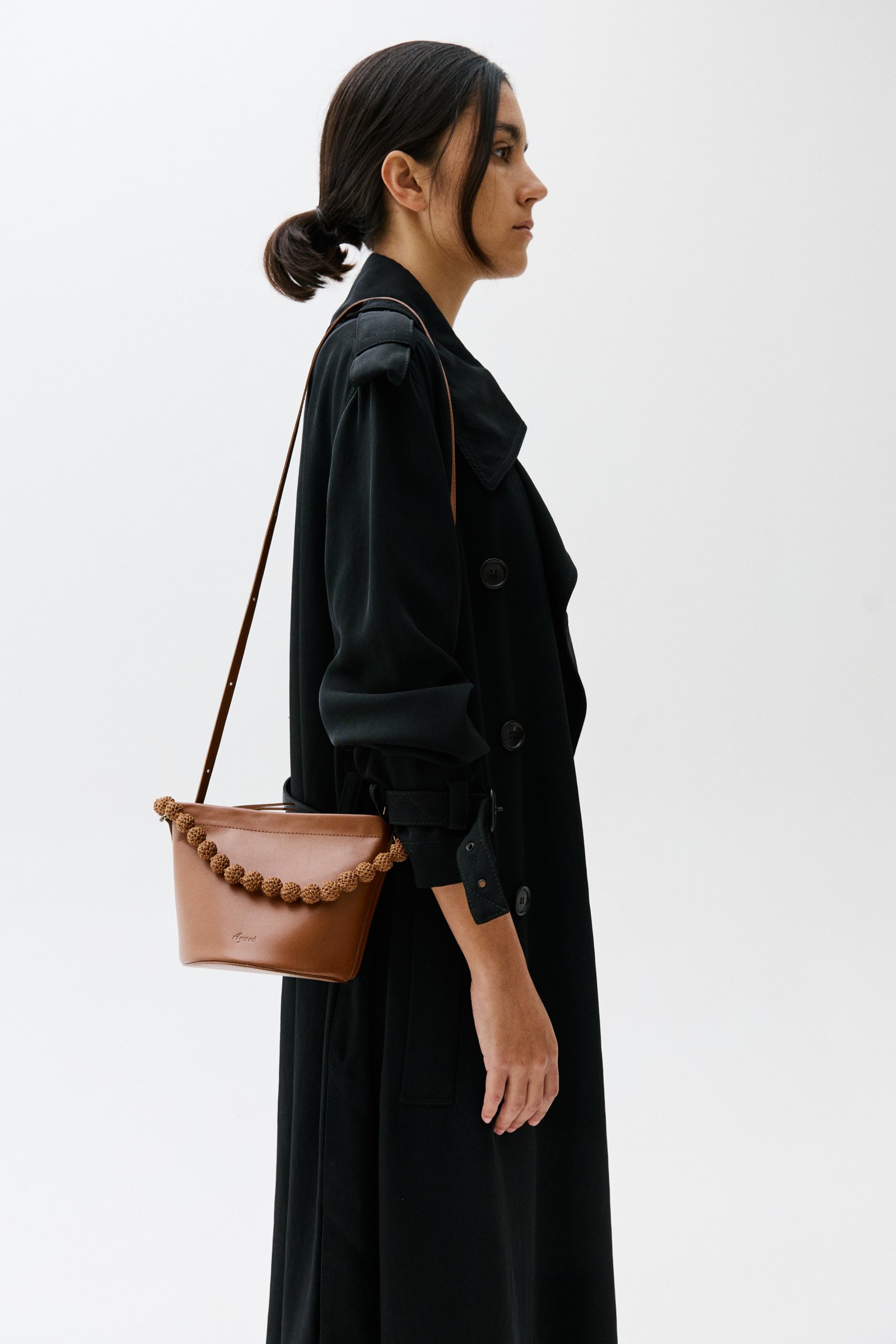 COWHIDE BAG WITH METALLIC ZIPPER. IT HAS A SHORT STRAP HAND-CROCHETED WITH WAXED COTTON CORD AND A LONG ADJUSTABLE COWHIDE STRAP.