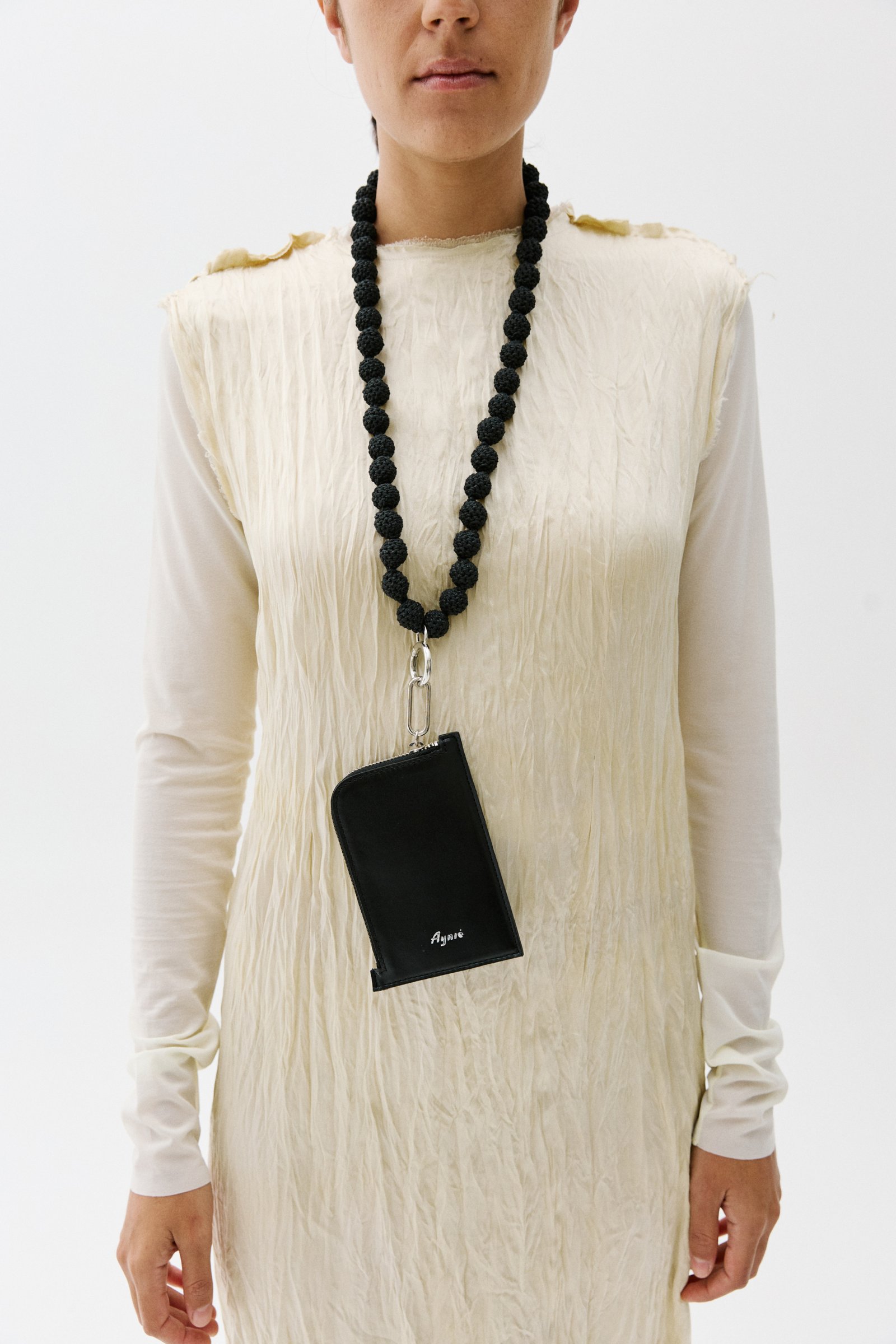 COWHIDE LEATHER ACCESSORY WITH METAL CLOSURE. IT IS WORN AROUND THE NECK WITH A HAND-CROCHETED LACE MADE OF WAXED COTTON CORD WITH A METAL CLASP THAT CAN BE USED SEPARATELY.