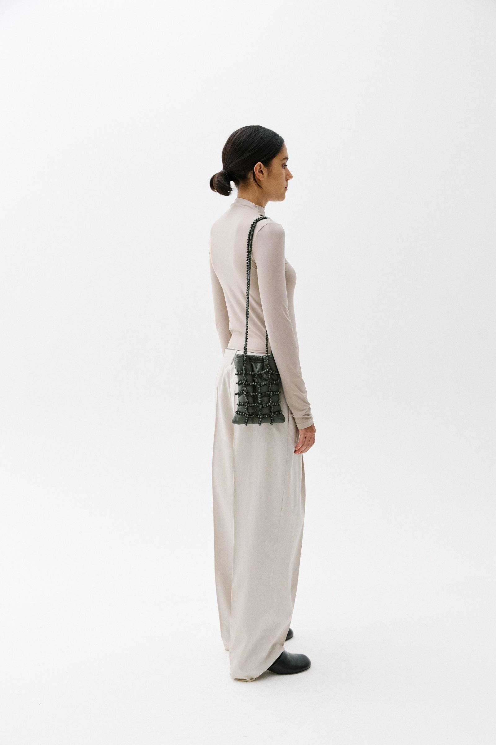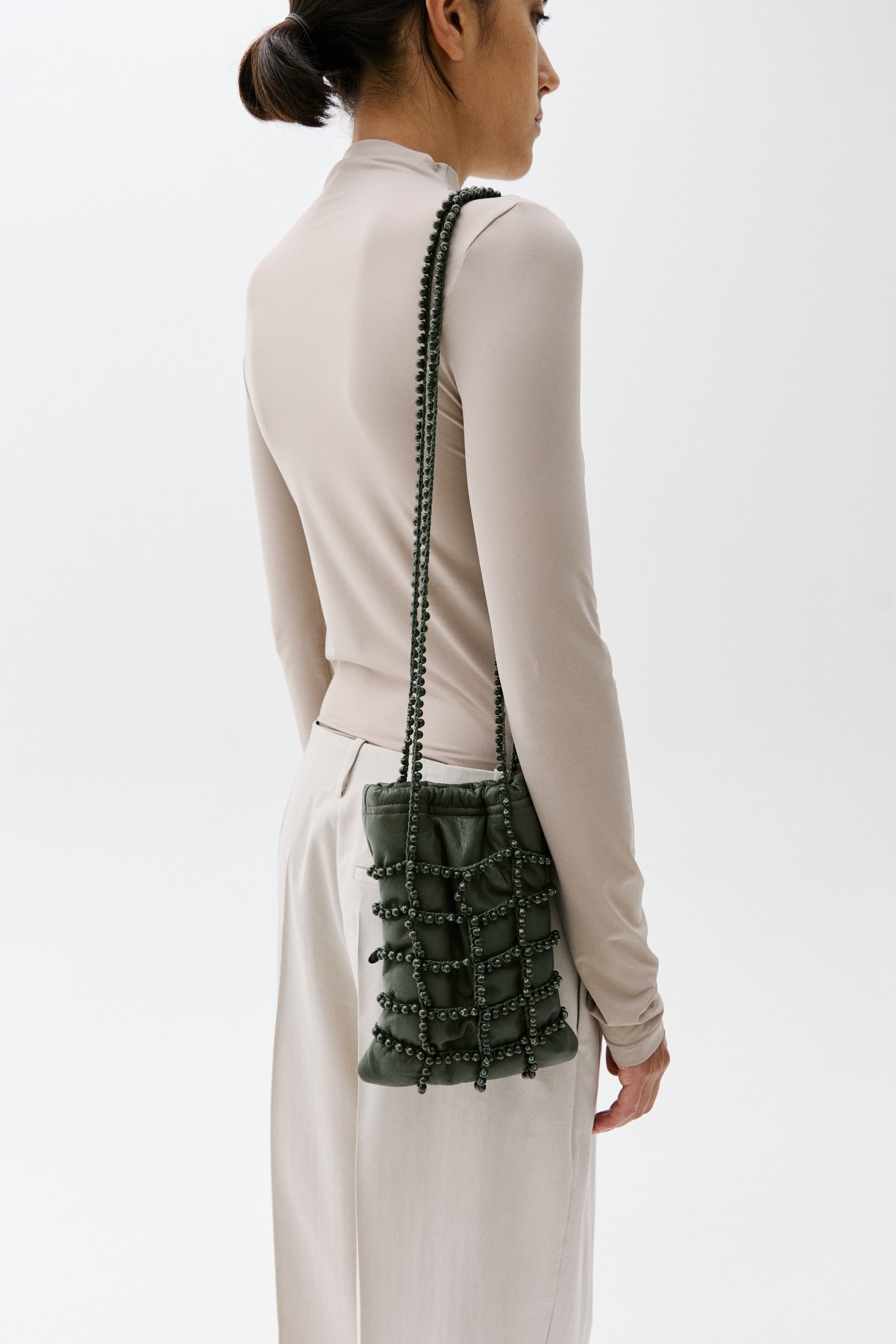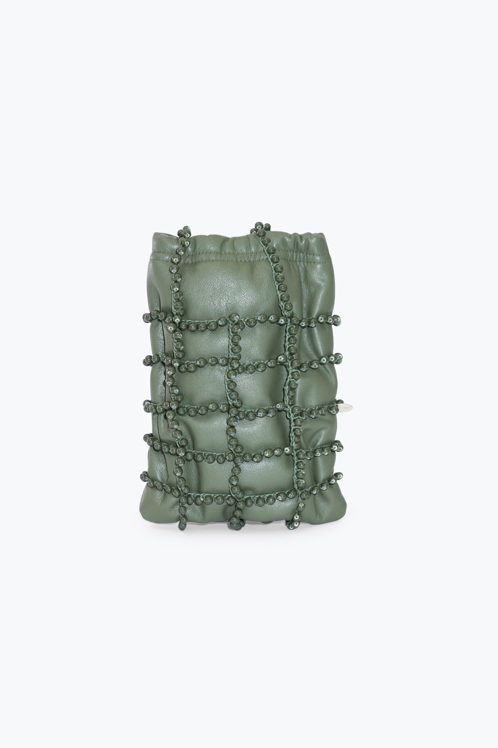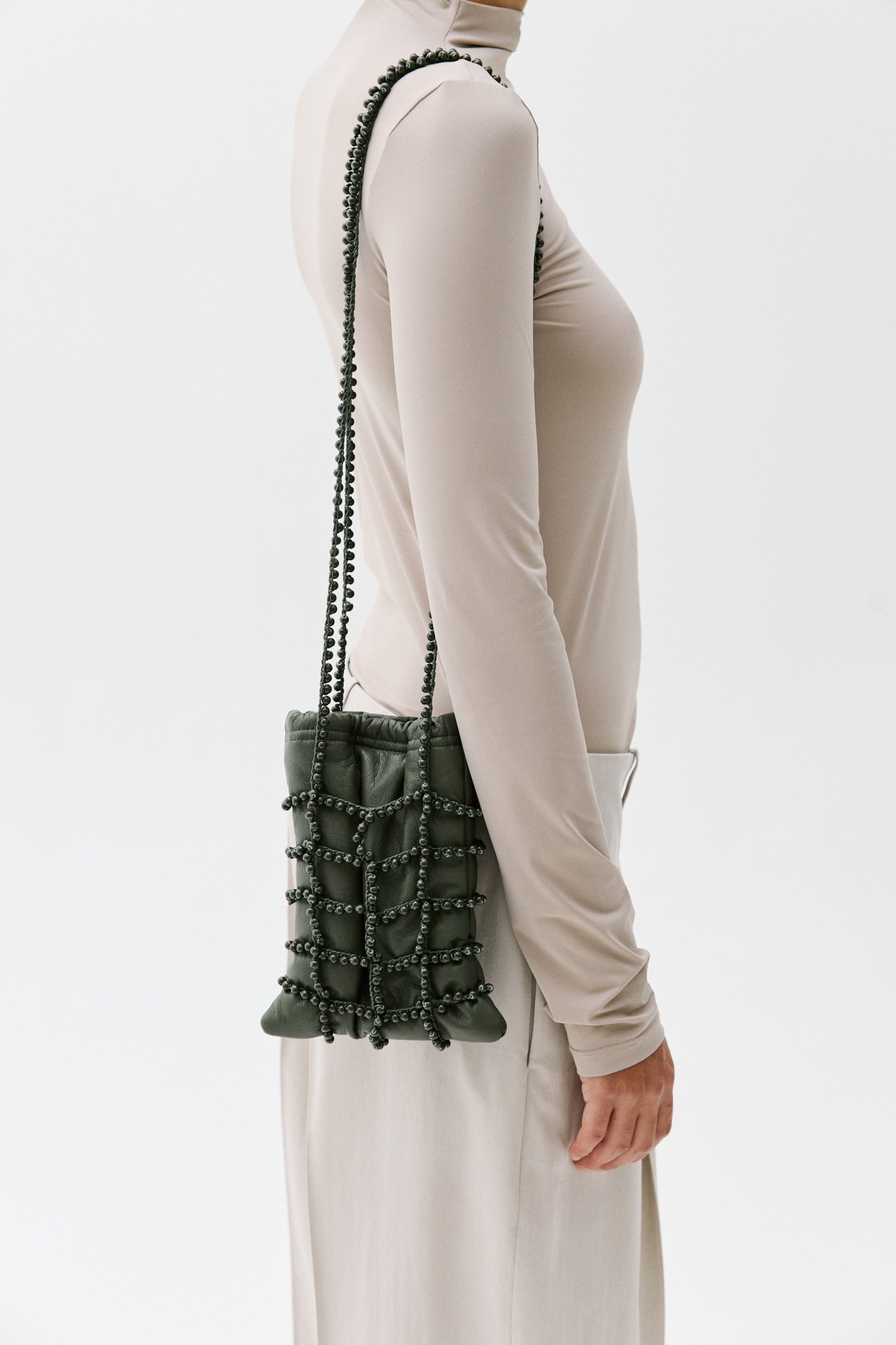 HAND BRAIDED BAG WITH COTTON CORD AND GLASS BEADS. SOFT LAMBSKIN POCKET. ELASTIC AND MAGNETIC CLOSURE. COTTON LINING.