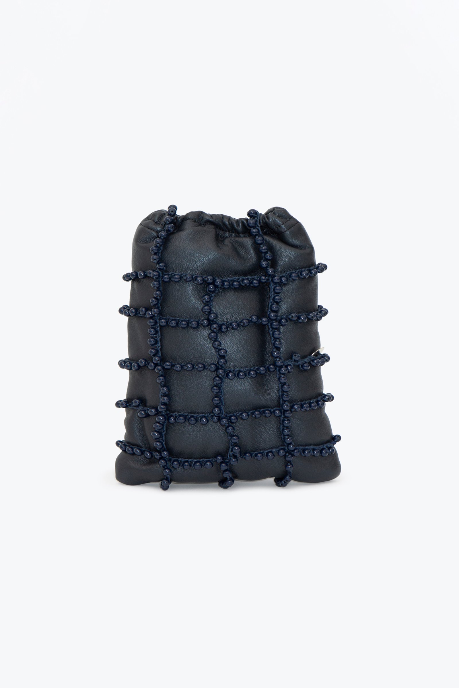 HAND BRAIDED BAG WITH COTTON CORD AND GLASS BEADS. SOFT LAMBSKIN POCKET. ELASTIC AND MAGNETIC CLOSURE. COTTON LINING.