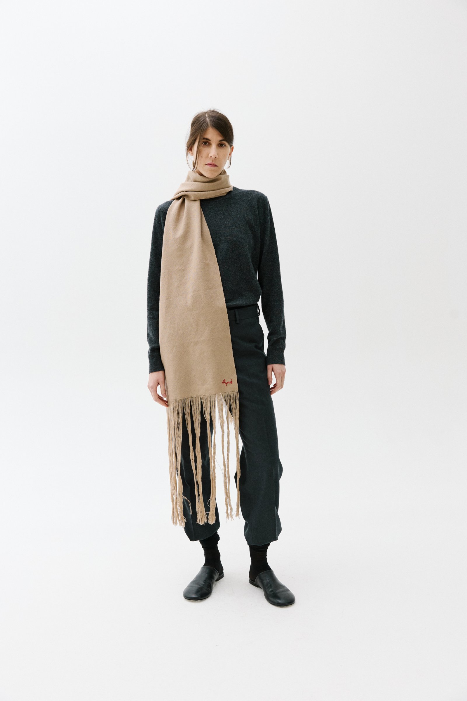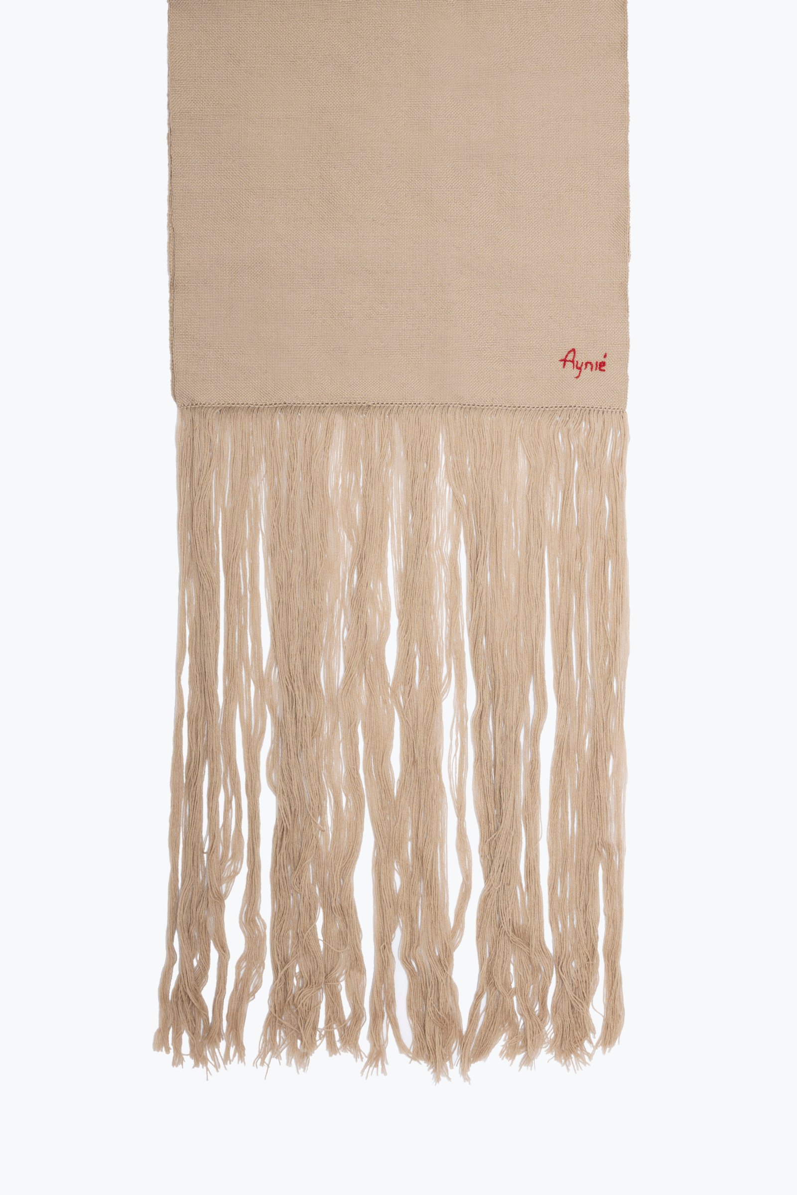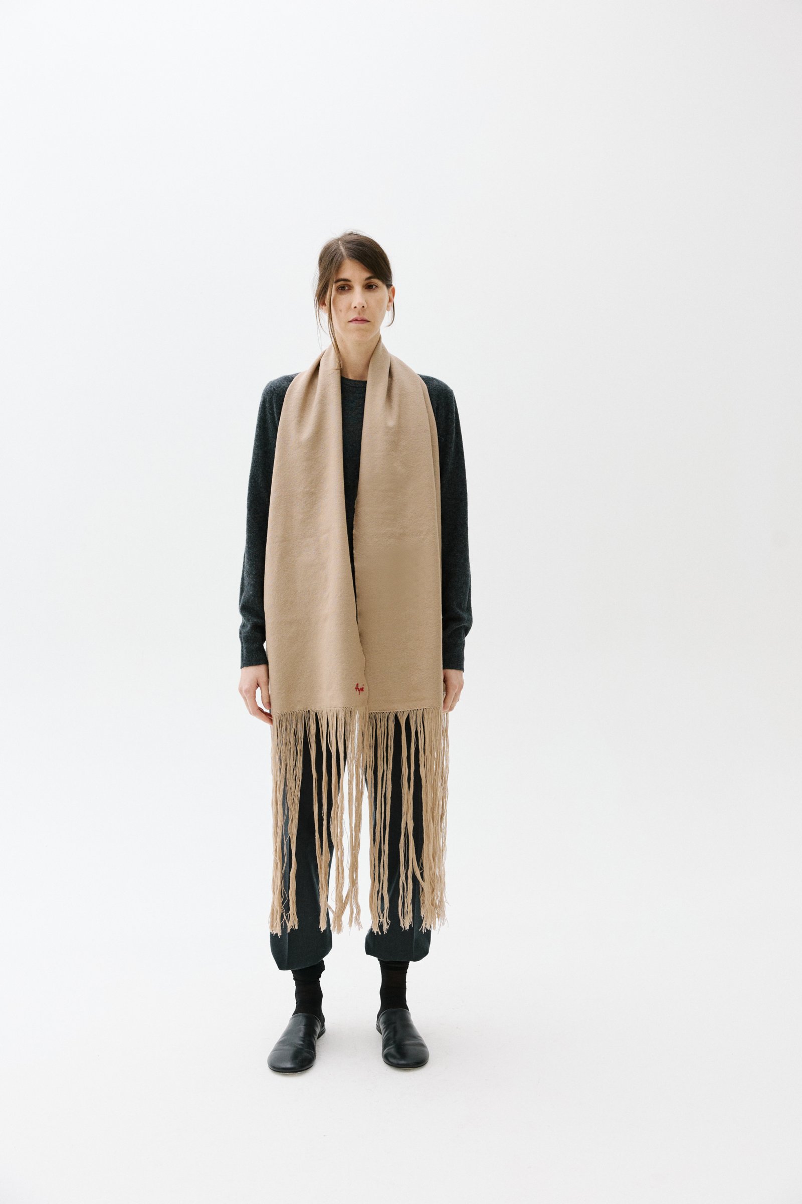 100% MERINO WOOL LOOM-KNITTED SCARF. IT HAS A HAND EMBROIDERY AND LONG TASSELS.