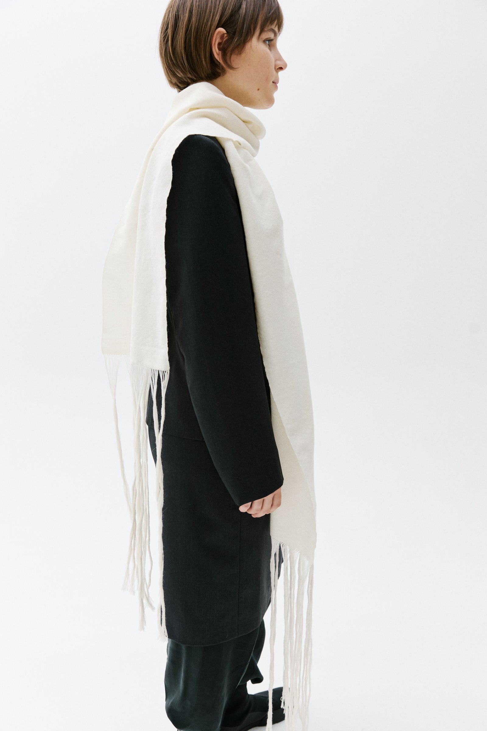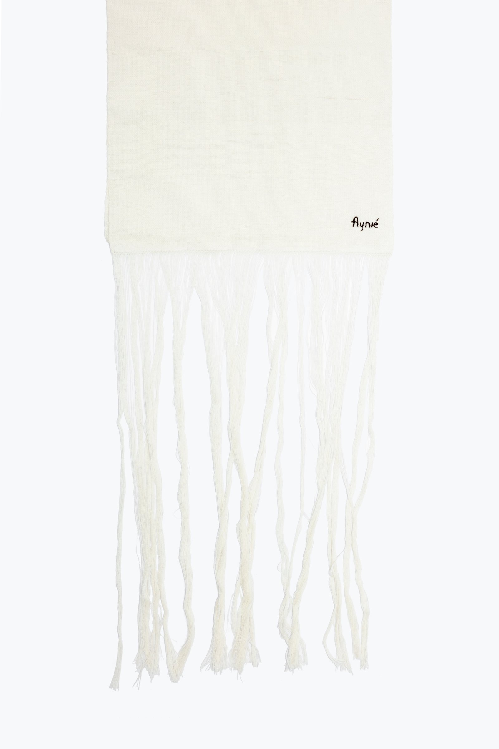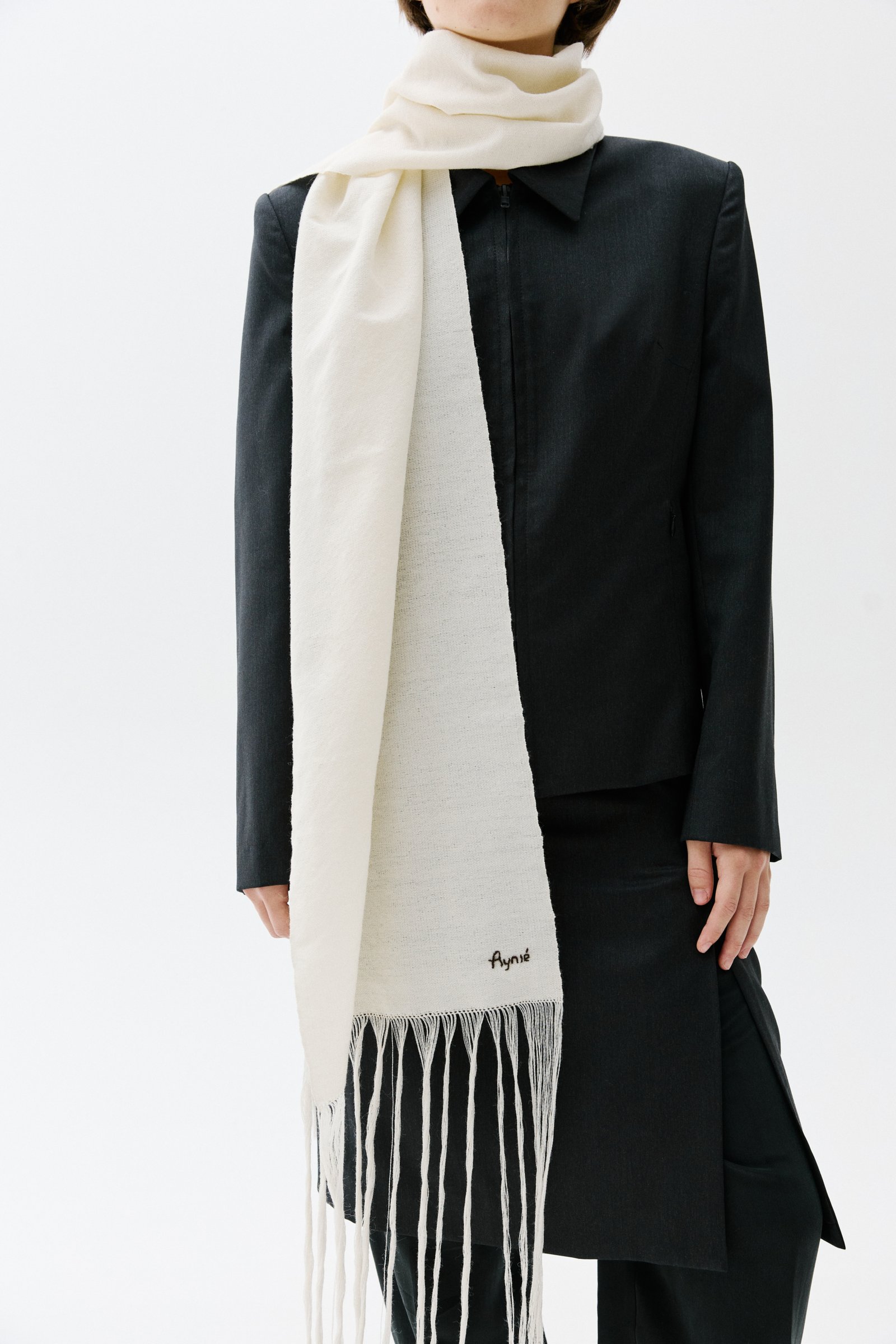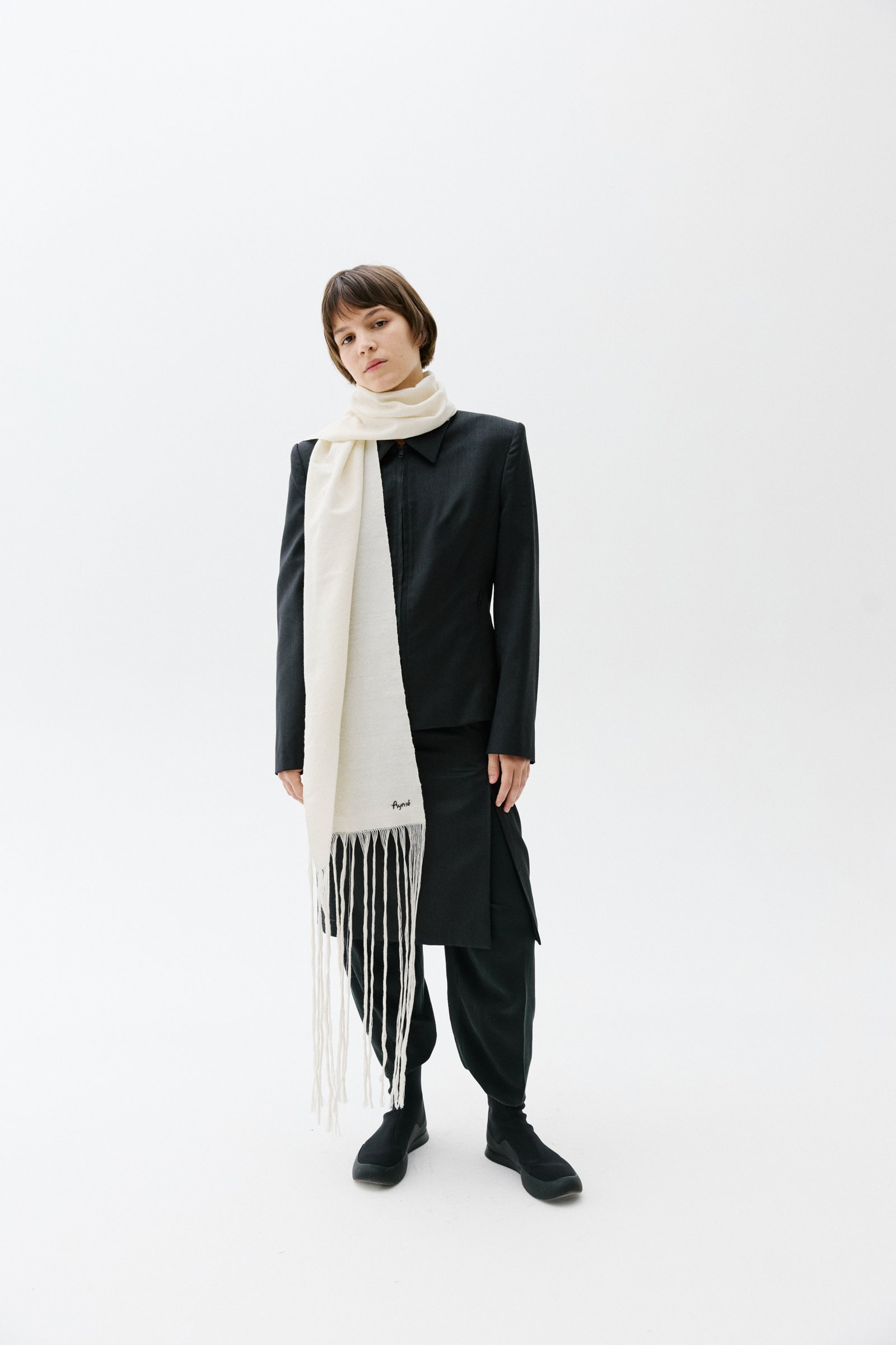 100% MERINO WOOL LOOM-KNITTED SCARF. IT HAS A HAND EMBROIDERY AND LONG TASSELS.