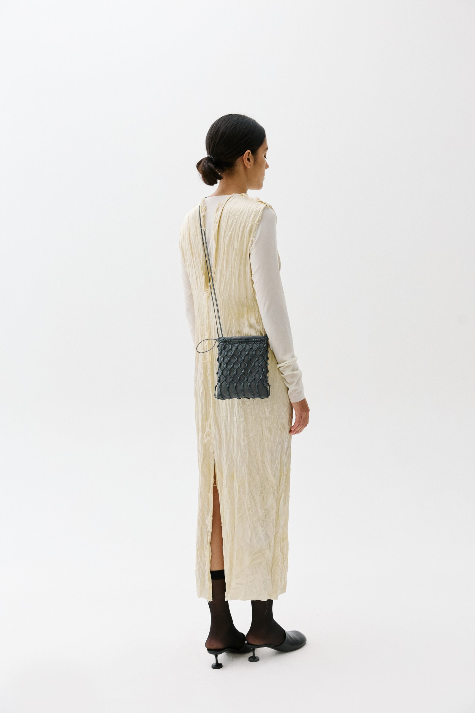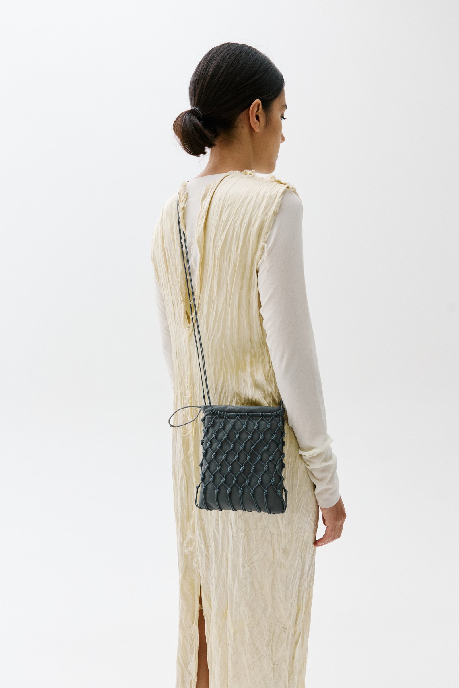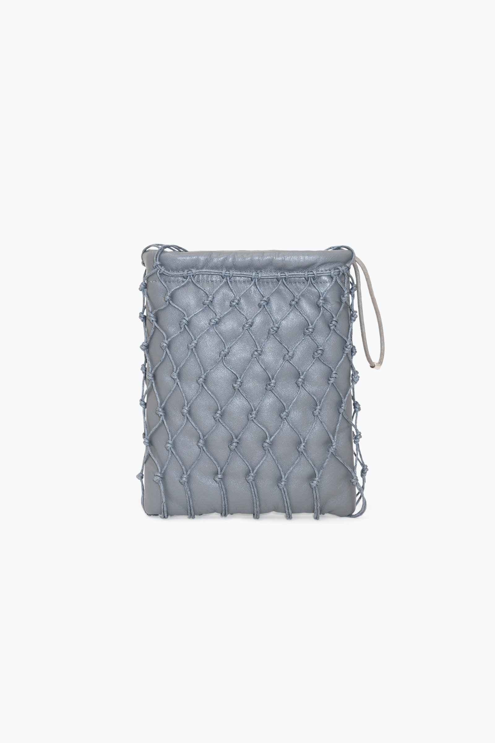 HAND-KNOTTED NET IN COTTON CORD WITH SOFT LAMBSKIN POCKET AND DRAWSTRING CLOSURE. IT HAS COTTON CROSSBODY STRAPS AND PURE COTTON LINING.