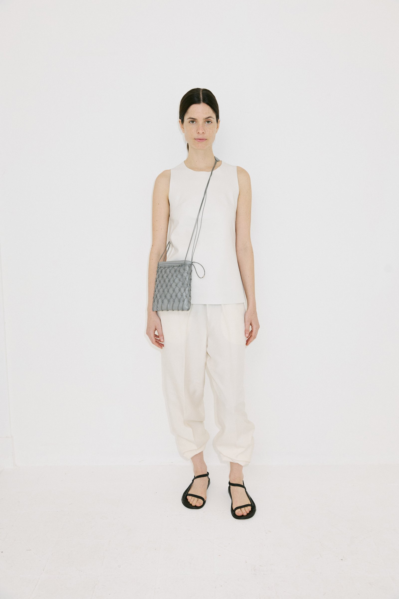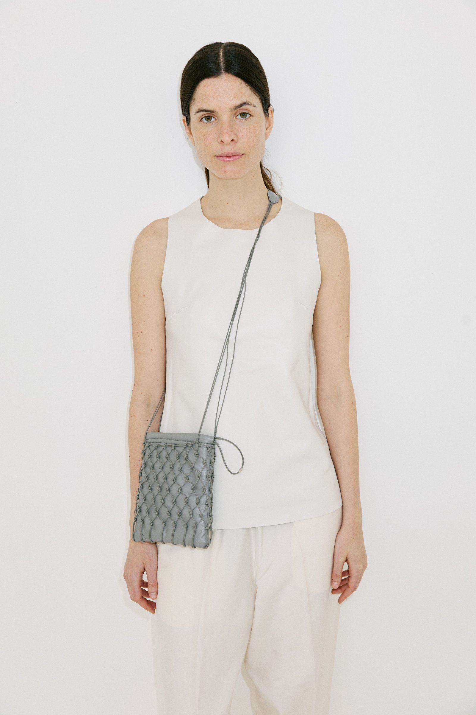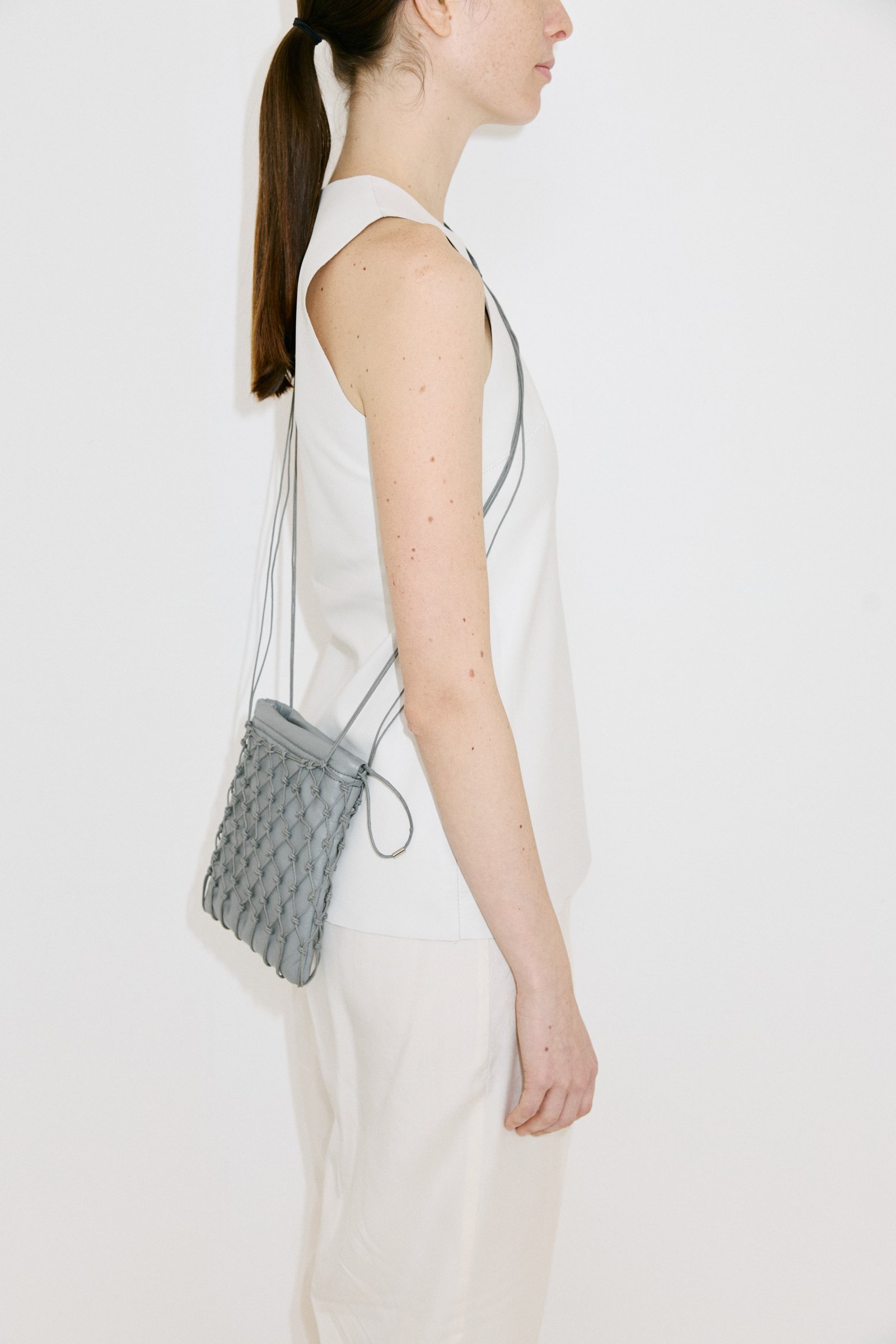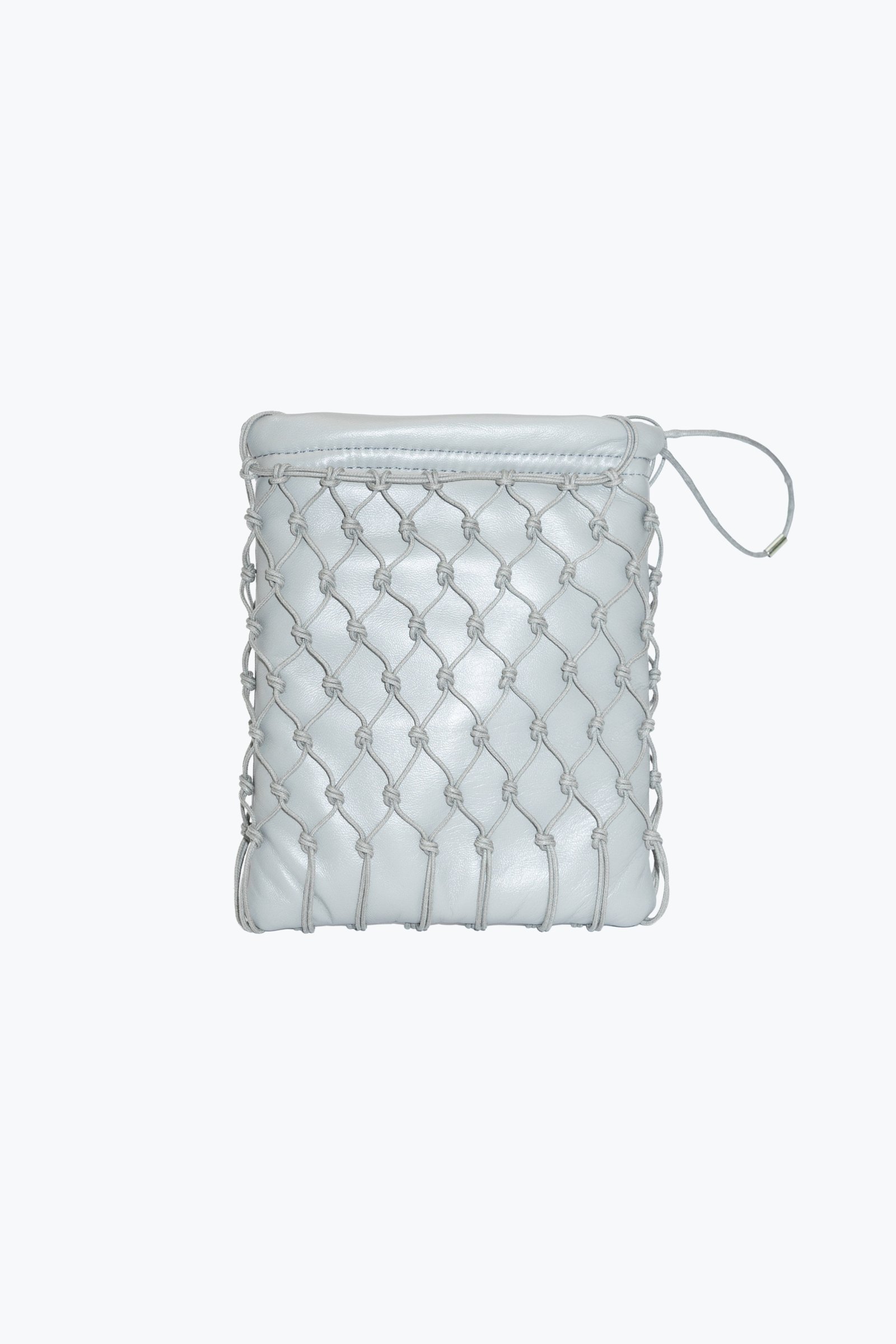 HAND-KNOTTED NET IN COTTON CORD WITH SOFT LAMBSKIN POCKET AND DRAWSTRING CLOSURE. IT HAS COTTON CROSSBODY STRAPS AND PURE COTTON LINING.