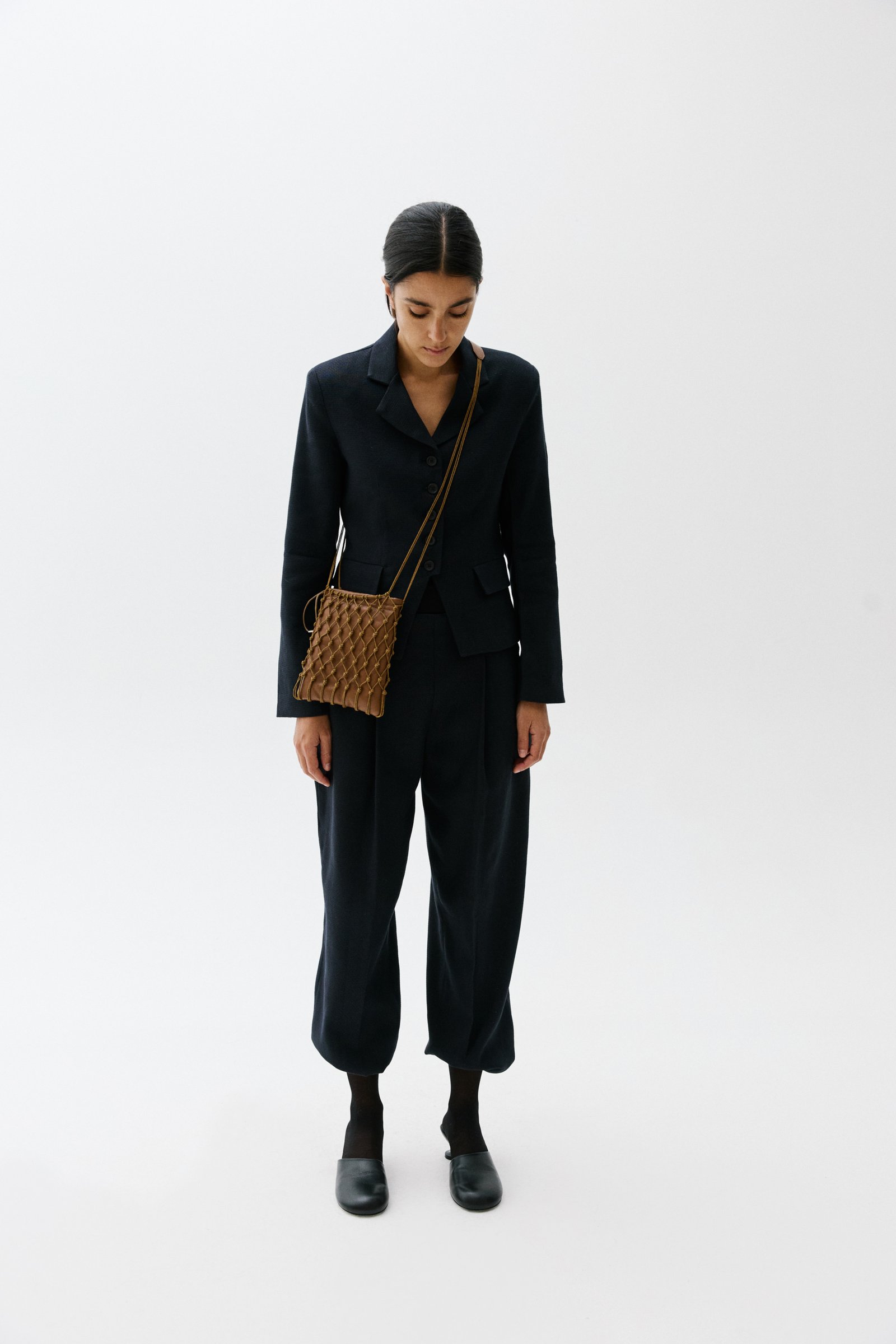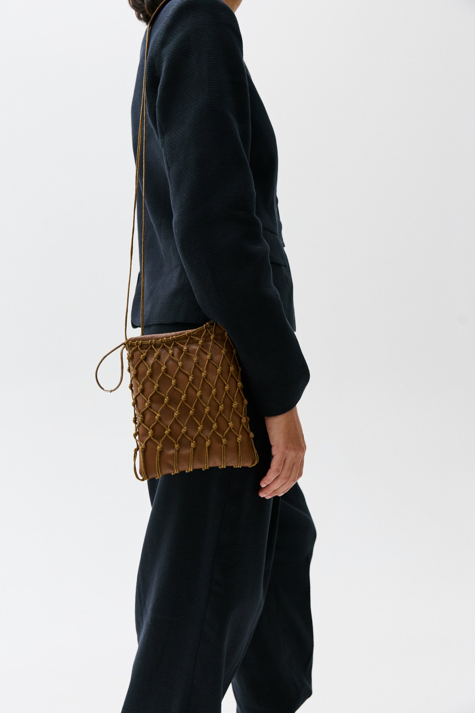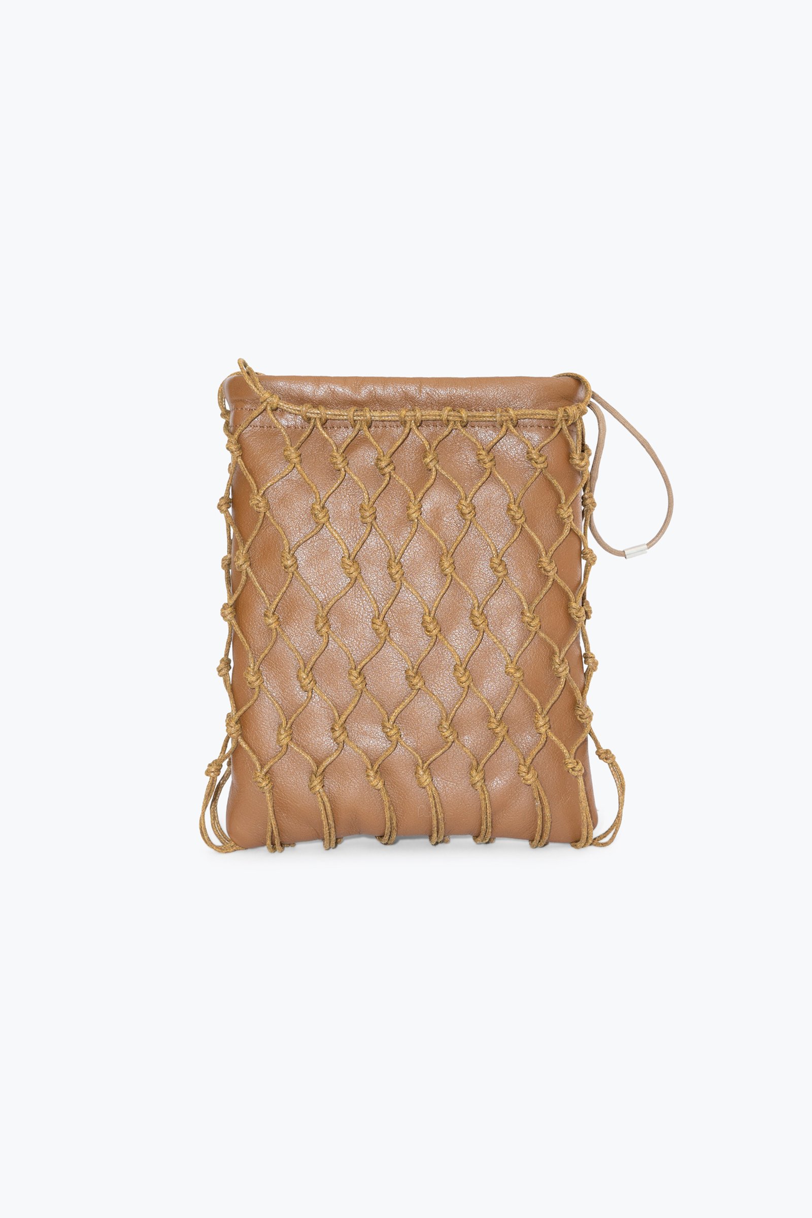 HAND-KNOTTED NET IN COTTON CORD WITH SOFT LAMBSKIN POCKET AND DRAWSTRING CLOSURE. IT HAS COTTON CROSSBODY STRAPS AND PURE COTTON LINING.