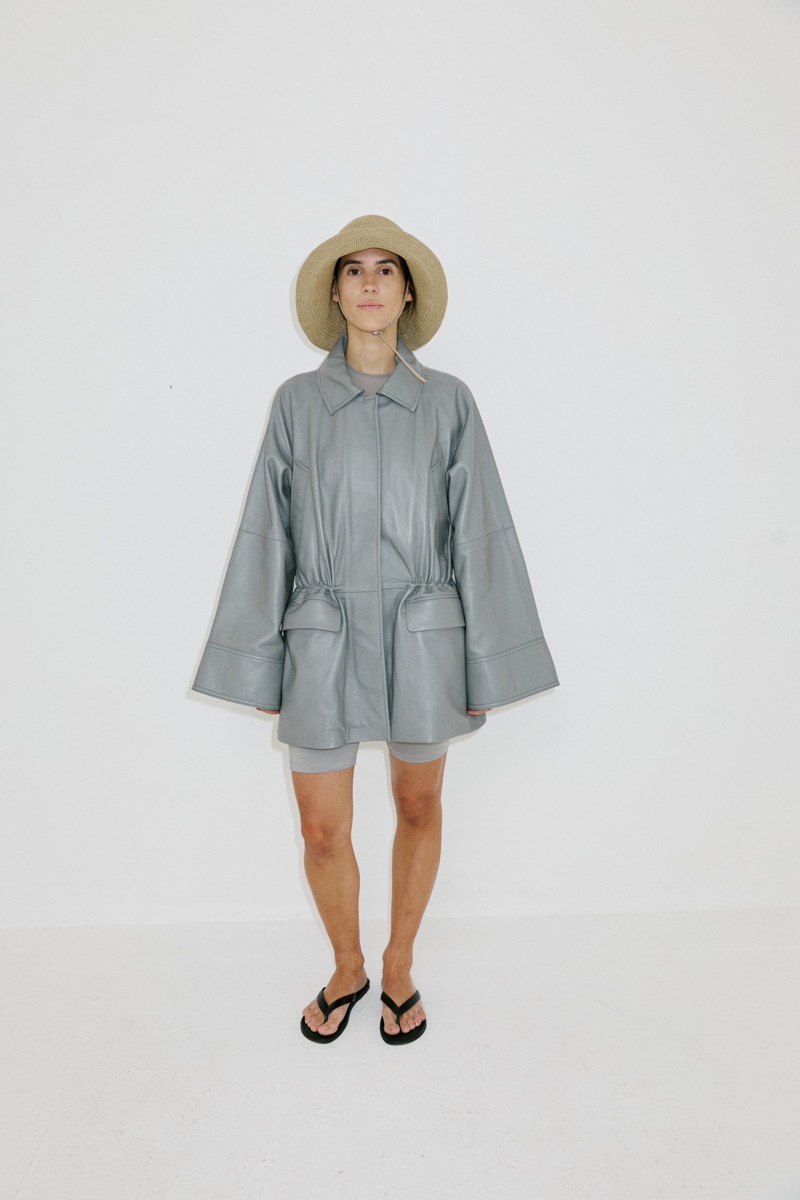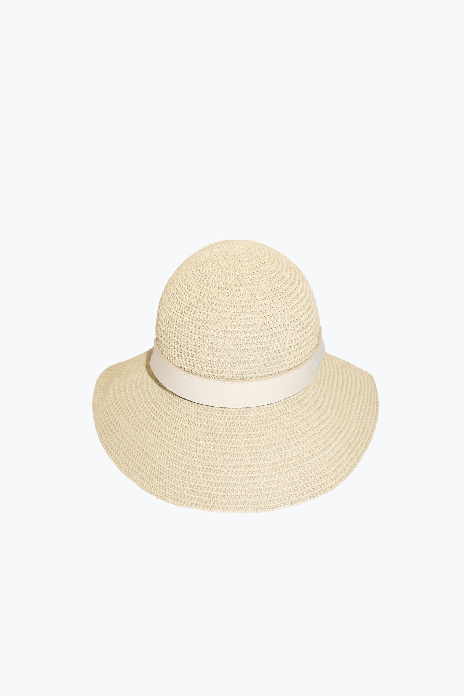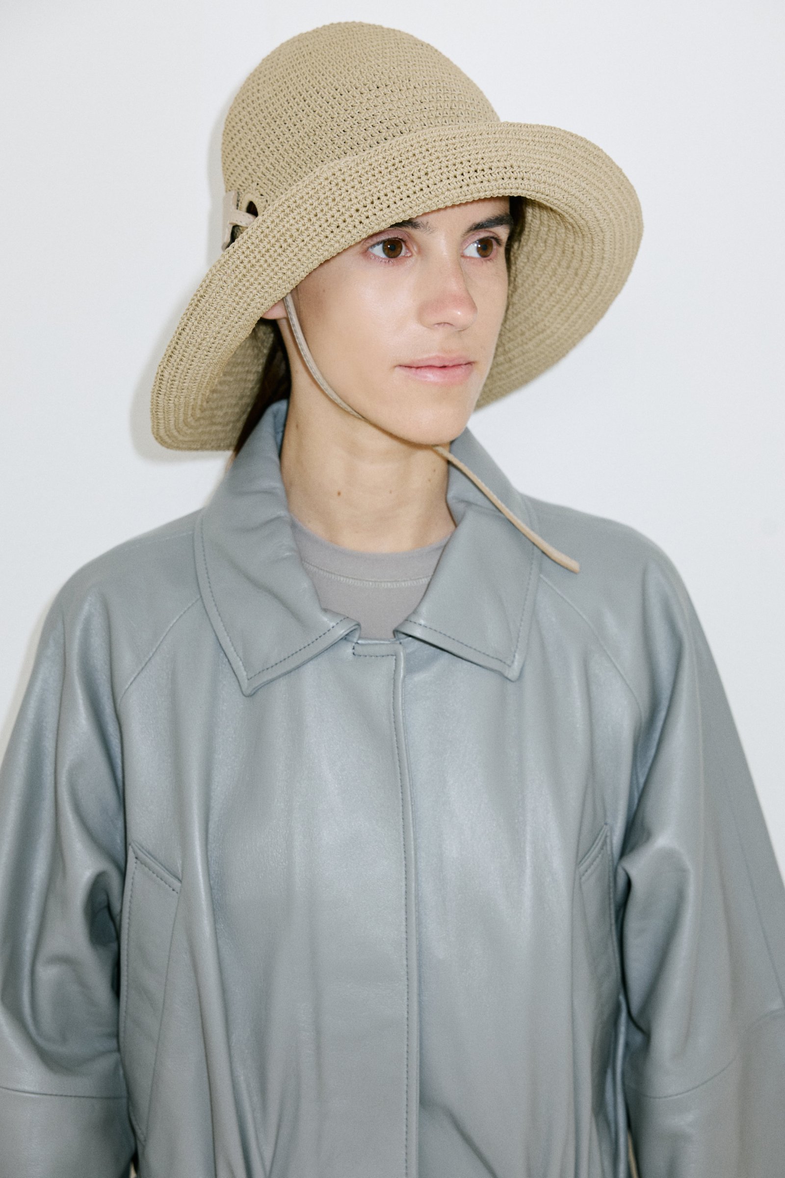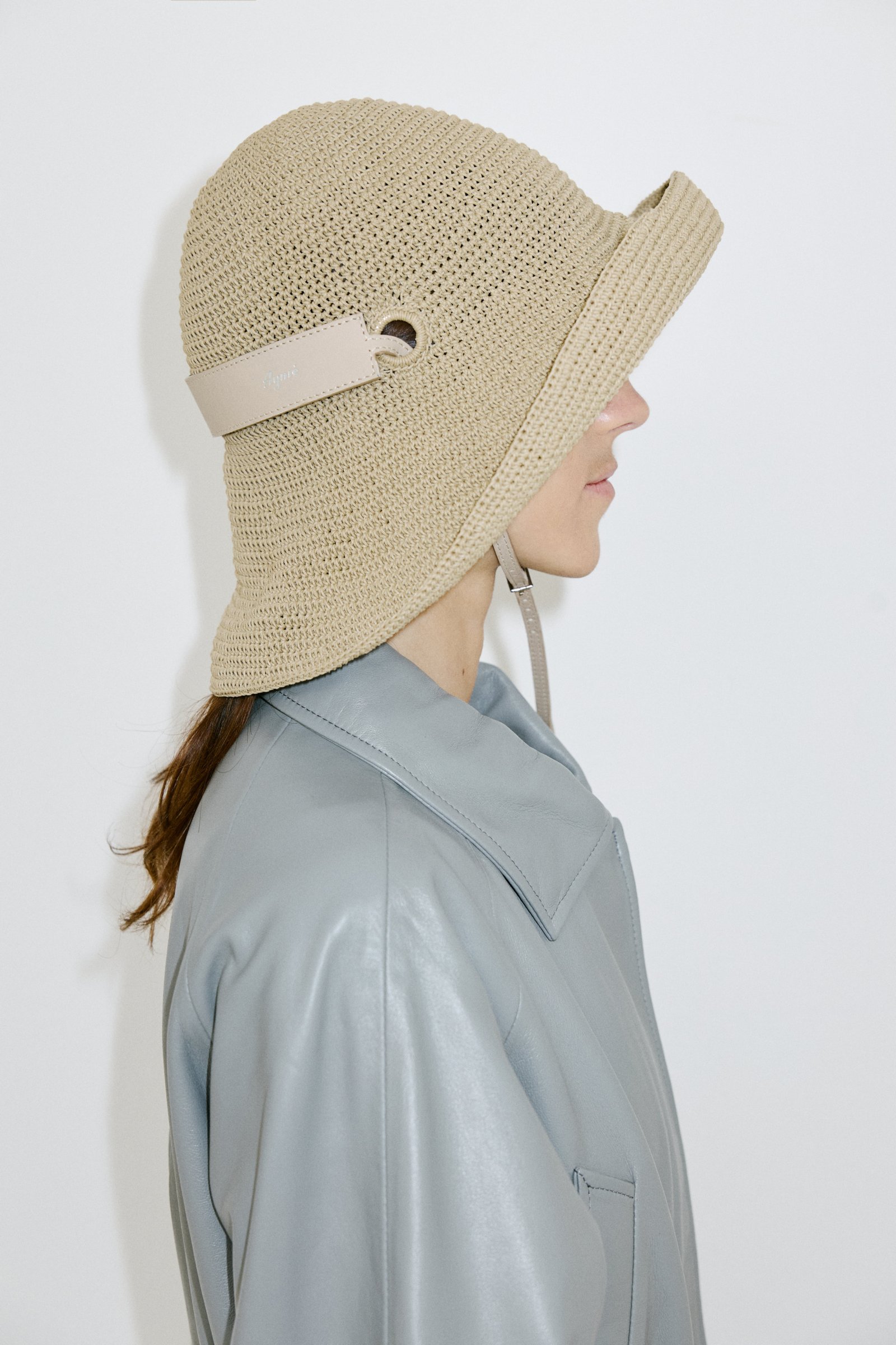 HAND-KNITTED HAT WITH WAXED COTTON THREAD. IT HAS A LEATHER STRAP WITH A METAL BUCKLE.